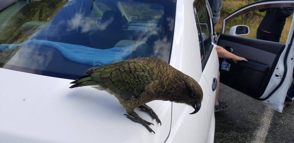 Po drodze mieliśmy okazję zobaczyć wszystkożerną a do tego drapieżną papugę Kea z rodziny kakapowatych. Upodobały sobie samochód, ale nie dało się go zjeść. Jak na papugę, jedna z inteligentniejszych. Lubi tarzać się w śniegu, ale również lepić śnieżki 🙂 Jak ktoś ma farta to podobno można natrafić na kakapo żyjącą w norach ziemnych, przypominająca sowę.